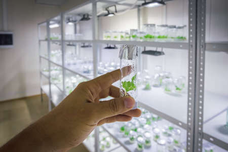 Green plant in laboratory tubes for research. Ecological breeding and plant development