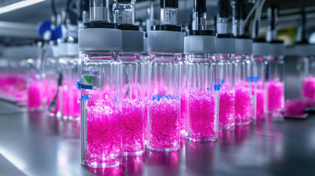 A striking image of glass vials filled with bright pink samples in a modern laboratory, highlighting advanced equipment and automated research processes.