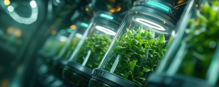 Test tubes filled with vibrant green plants, displayed under neon lights in a modern laboratory, exemplify biochemistry research and the integration of nature with technology.