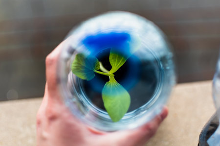 AI generated young plant growing inside a transparent glass bottle held by hand in clean lab environment showing growth and scientific precision with hopeful mood and sustainable vision
