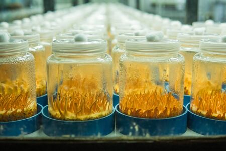 Growth of Gold Cordyceps, Cordyceps militaris in a bottle on the farm