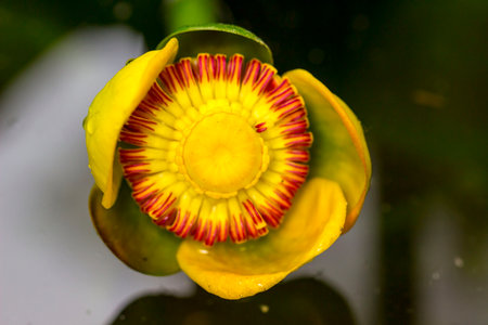 The yellow pod is a blooming flower. close-up. natural light, an aquatic plant. a flower on the water. spatterdock.; yellow water lily. Nuphar lutea. Nymphaeaceae.