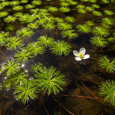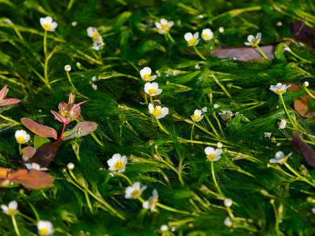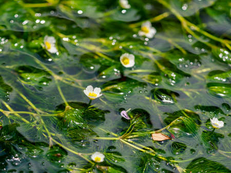 Detail of white blossom water crowfoot, batrachium aquatile on small pond, Czech republic