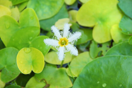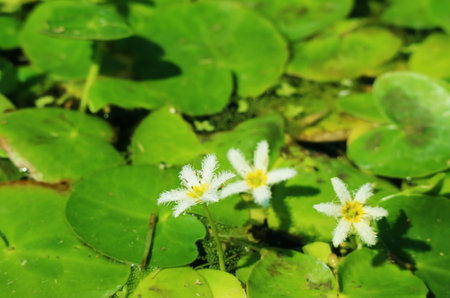 Closeup of a Tiny Snowflake Water Lily or White Water Fringe on Vibrant Green Pads