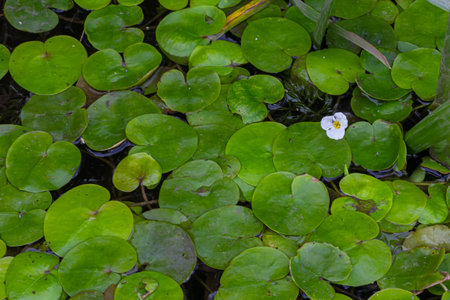 Aquatic plant frogbit floats on the surface of clean river water