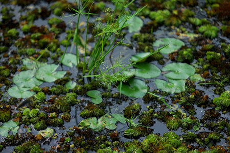 Small green aquatic plants floating in a swamp