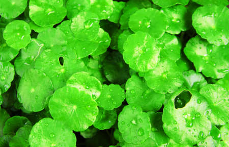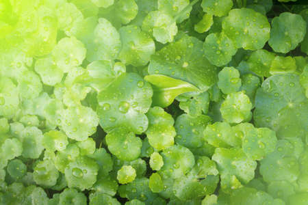 Blurred fresh green leaf with water drops background. Blurry Centella Asiatica leaves covered with many water drops after raining.