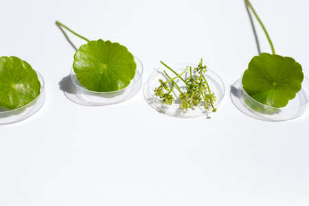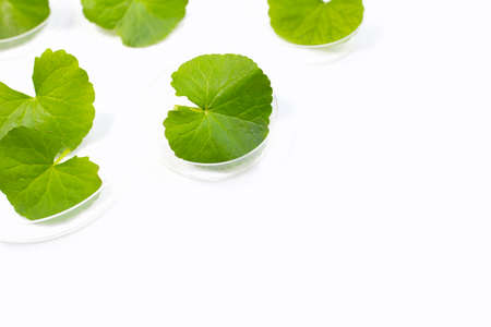 Fresh leaves of gotu kola in petri dishes on white background.