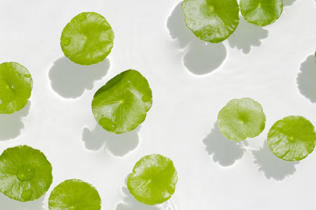 Fresh green leaves of Centella asiatica or gotu kola or asiatic pennywort, floating on water. It is a medicinal herb with many health benefits.