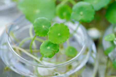 Fresh green centella asiatica leaves with flower in petri dishes on white background.