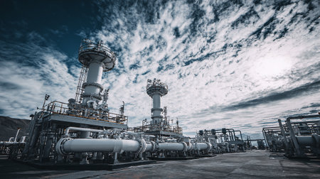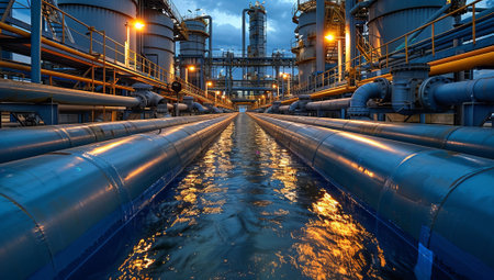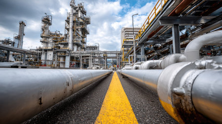 Industrial landscape with refinery infrastructure and pipes under a dramatic sky