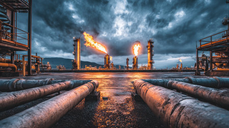 A captivating industrial scene showcases gas flares igniting against a dark, cloudy sky, emphasizing the energy production and environmental implications of oil refinement.