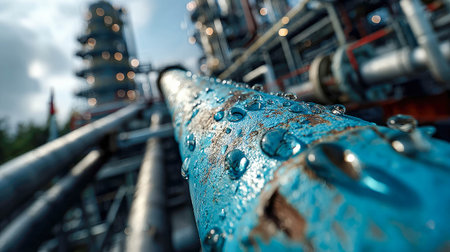 Close-up of a wet blue industrial oil pipeline at a refinery plant, featuring bolts, steel texture, and background structures.