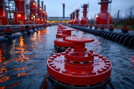 Industrial Red Valves on Pipelines Against Twilight Sky at Oil Refinery
