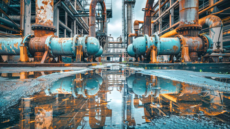 This image showcases a detailed view of industrial pipes and machinery, emphasizing the rusty condition of metal surfaces in a manufacturing plant setting.