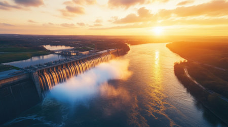 A hydroelectric dam at sunset, the warm, soft light reflecting off the water symbolizing the generation of clean, renewable energy