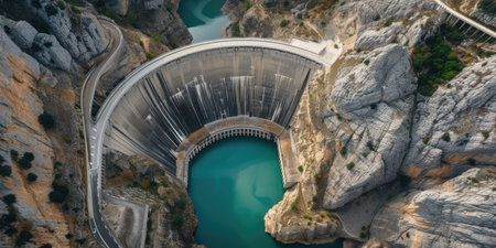Generative AI, hydroelectric dam utilizing the flow of water to produce sustainable energy, aerial drone view,