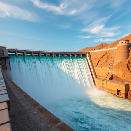 A hydroelectric dam is seen releasing a torrent of water, demonstrating sustainable energy generation and water management