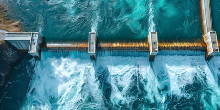 Aerial view of a hydroelectric power plant, water rushing through turbines with the surrounding landscape, emphasizing renewable energy
