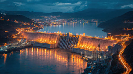 Stunning aerial view of a hydroelectric dam illuminated at twilight, reflecting bright lights on the calm water surface, showcasing incredible engineering.
