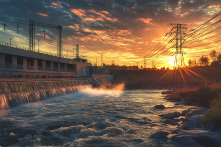 Hydroelectric power plant generating clean energy at sunset, with water flowing through the dam and electricity pylons in the background