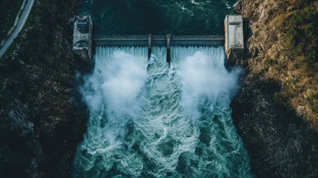 A stunning aerial view of a hydroelectric dam, showcasing the powerful water flow and cascading motion, highlighting the blend of nature and technology.