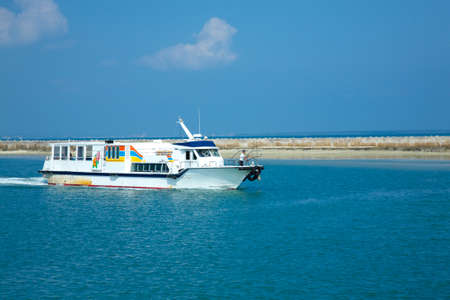 Ferry for passengers and cars in the blue sea with blue sky and white clouds and copy space a tranquil seascape scene