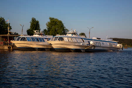 Sortavala, Russia - July 10, 2021: Passenger high-speed hydrofoils at the pier in the city of Sortavala in the Republic of Karelia in Russia