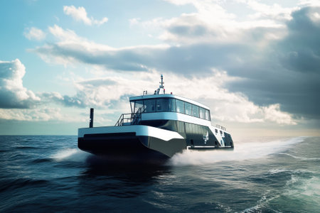 A sleek ferry moves swiftly across the water as clouds gather overhead during sunset.