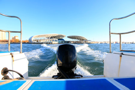 High speed boat moves fast on the sea surface.