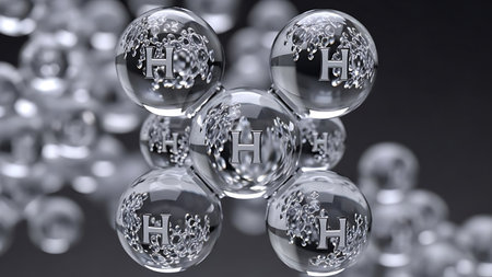 Digital rendering of hydrogen molecules floating against a dark blue background symbolizing scientific research.