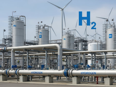 An industrial hydrogen production facility featuring wind turbines, storage tanks, and pipelines.