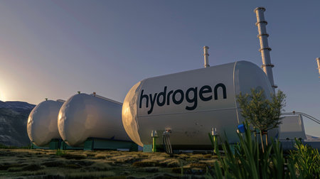 Bright hydrogen storage tanks gleam under the sun, set against a blue sky, representing advanced hydrogen production technology and sustainability.