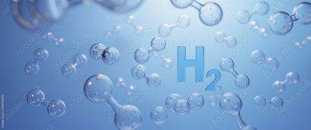 Abstract transparent hydrogen H2 molecules on blue background, clean energy or chemistry concept, 3D illustration