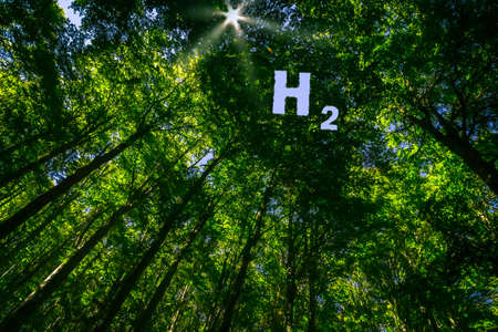 Hydrogen H2 energy, hydrogen power, clean energy icon on the top view of the forest for environmental sustainability, limit global warming and climate change, reducing carbon emissions concept.