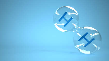 H2 hydrogen symbol in bubble floating on blue background, clean energy, liquid hydrogen or chemistry concept, 3D illustration