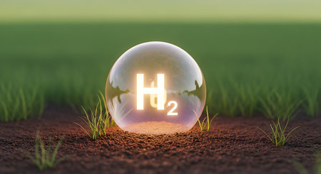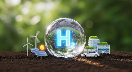 A globe symbolizes hydrogen's role in clean energy, surrounded by a vibrant green setting. The focus is on sustainability and environmental consciousness in today's world.
