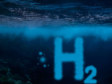 blue hydrogen h2 letters with lot of bubbles in a blue water with sunbeams
