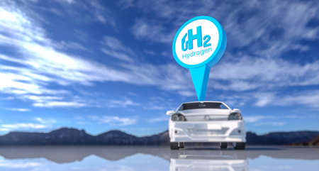 A blurred photo of a lake with mountains and a 3D rendering of a car and H2 Hydrogen sign on the top of it