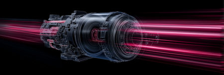 High-tech motor with glowing core and speed lines illustrating advanced performance. High power motor displaying internal energy and engineering