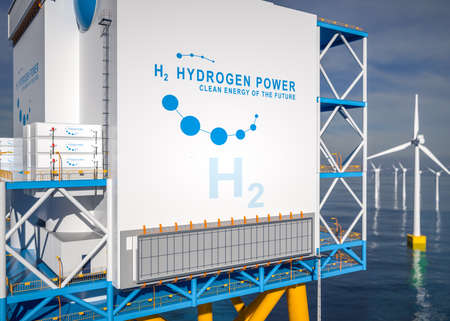 Hydrogen renewable offshore energy production - hydrogen gas for clean electricity solar and windturbine facility. 3d rendering.