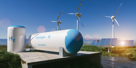 Hydrogen renewable energy production - hydrogen gas for clean electricity solar and wind turbine facility.
