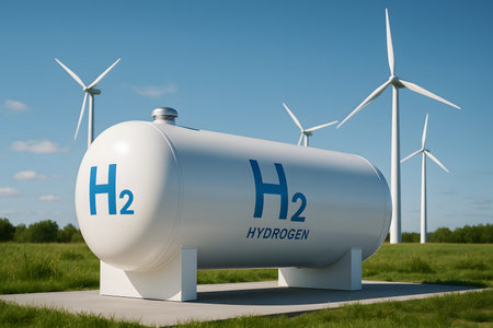 Hydrogen storage tank with wind turbines, symbolizing green energy and sustainability.