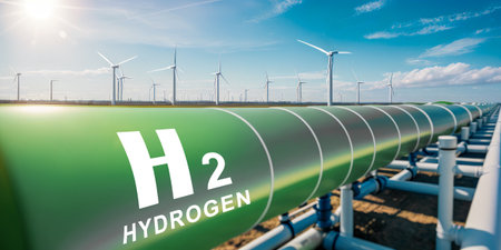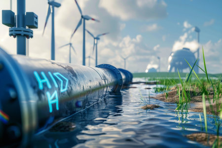 Sustainable green hydrogen production with wind turbines and pipeline in the background