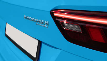 Aachen / Germany - January 31 2020: hydrogen logo on gas stations fuel dispenser. h2 combustion engine for emission free eco friendly transport.
