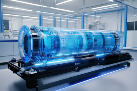 A futuristic blue component rests on a stand in a high-tech laboratory filled with equipment.