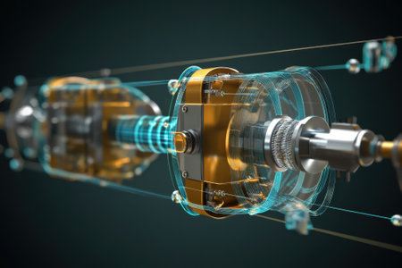 A close-up of polished metallic parts with intricate bolt arrangements and interconnected piping, showcasing advanced engineering craftsmanship and industrial innova