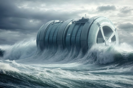 Stormy weather unleashes huge waves against a colossal and futuristic structure on the water.