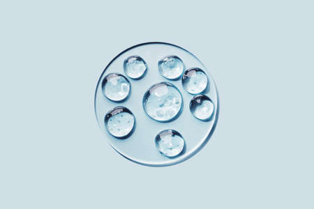 Samples of gel cosmetic products in a Petri dish on blue background, hard shadows