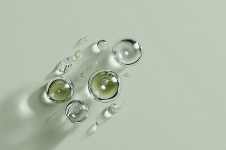 Detailed view of bubbles and droplets floating in liquid, exhibiting beautiful shapes and light reflections, highlighting surface tension and clarity.